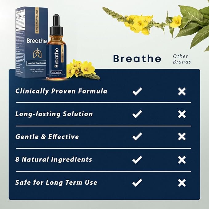 Breathe is formulated with natural compounds that help loosen and clear excess mucus, opening blocked respiratory passages. This helps improve airflow and promotes easier, more comfortable breathing, especially for individuals facing chronic congestion or environmental exposure.